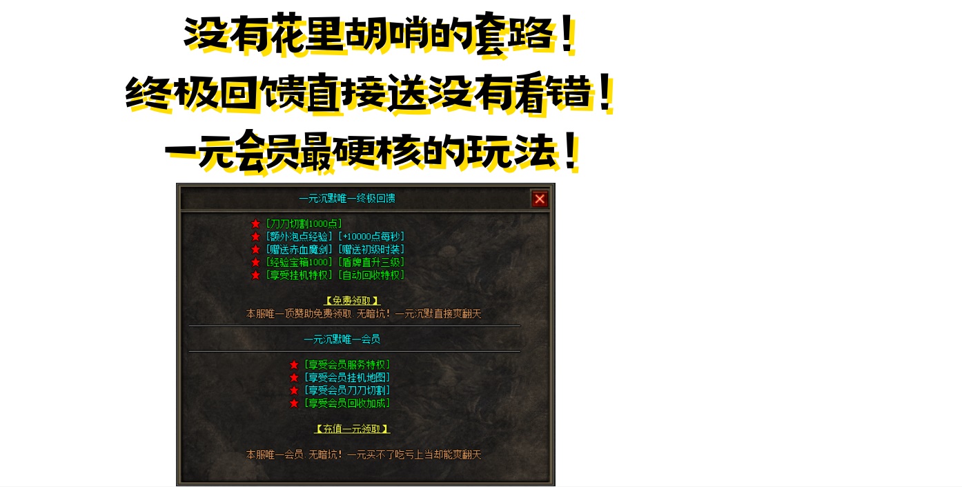 【游戏充值】:充值点1:1 充值点只能开通一块的会员,无其他作用,一切靠打真男人!